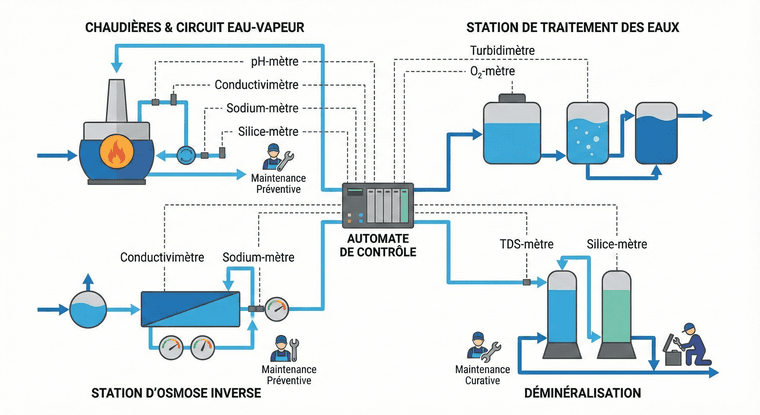 Nous intervenons sur des instruments de mesure essentiels tels que le pH-mètre, conductivimètre, sodiummètre, silice-mètre, turbidimètre, oxymètre et TDS, ainsi que sur l’ensemble du circuit eau-vapeur des chaudières, les stations de traitement des eaux et les unités d’osmose inverse et de déminéralisation. Chaque intervention est réalisée avec rigueur pour assurer la précision des mesures et la fiabilité des systèmes.
