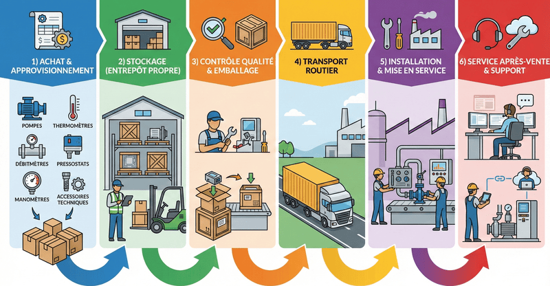 Nous simplifions le processus d’achat pour nos clients en coordonnant avec les fournisseurs, en vérifiant la conformité des produits et en gérant la logistique de livraison. Cela garantit que vos équipements industriels sont reçus à temps, avec documentation complète et traçabilité.